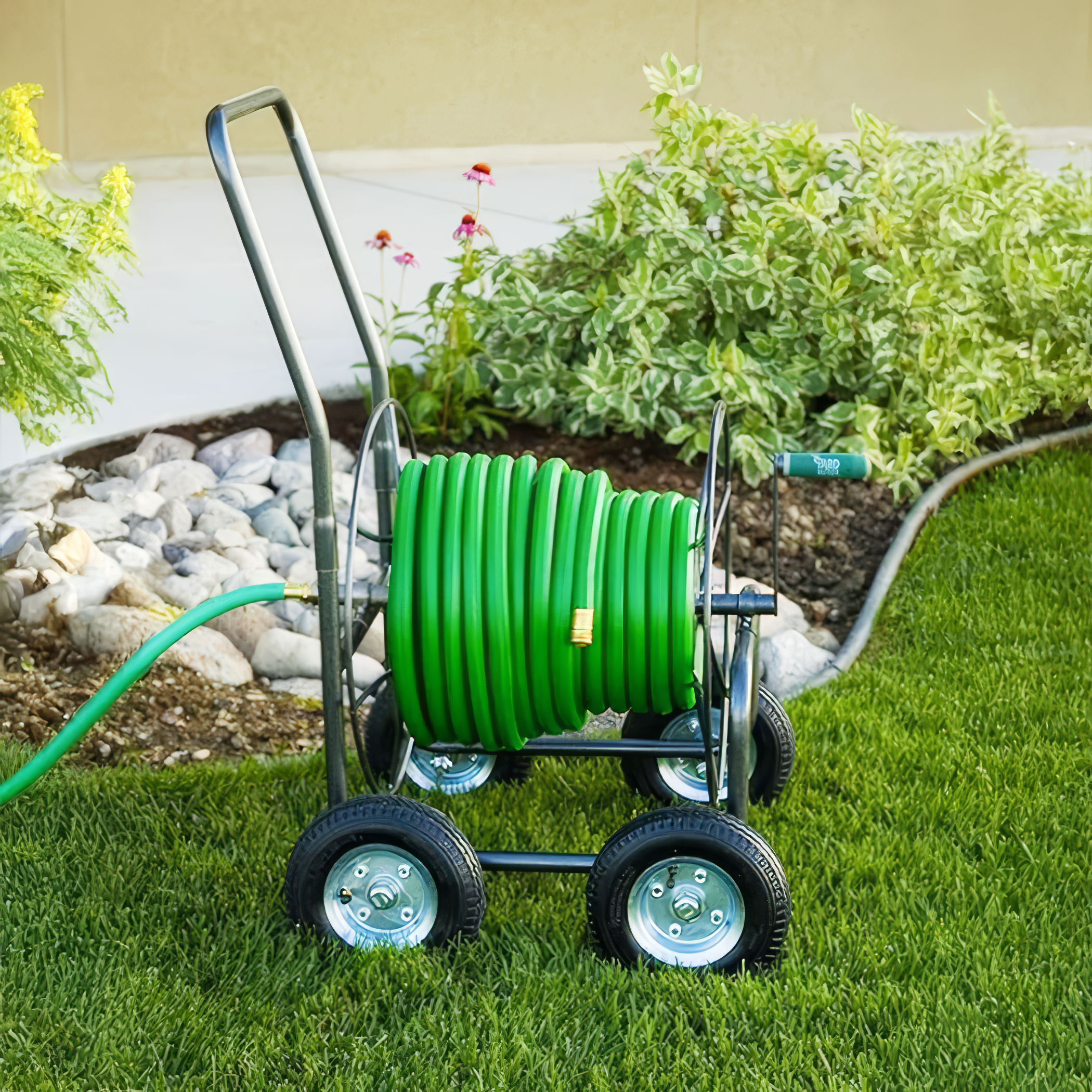 - Stable under load: Heavy-gauge steel frame and solid, flat-free tires support water-filled hose weight